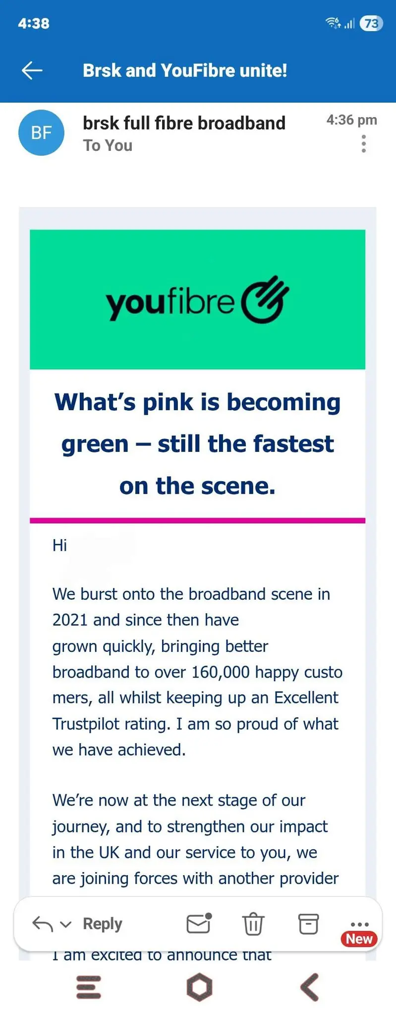 The change is already being communicated directly to customers, with brsk subscribers now receiving emails confirming that the pink brsk brand will transition to YouFibre’s green identity, while reassuring users that their service remains unchanged.