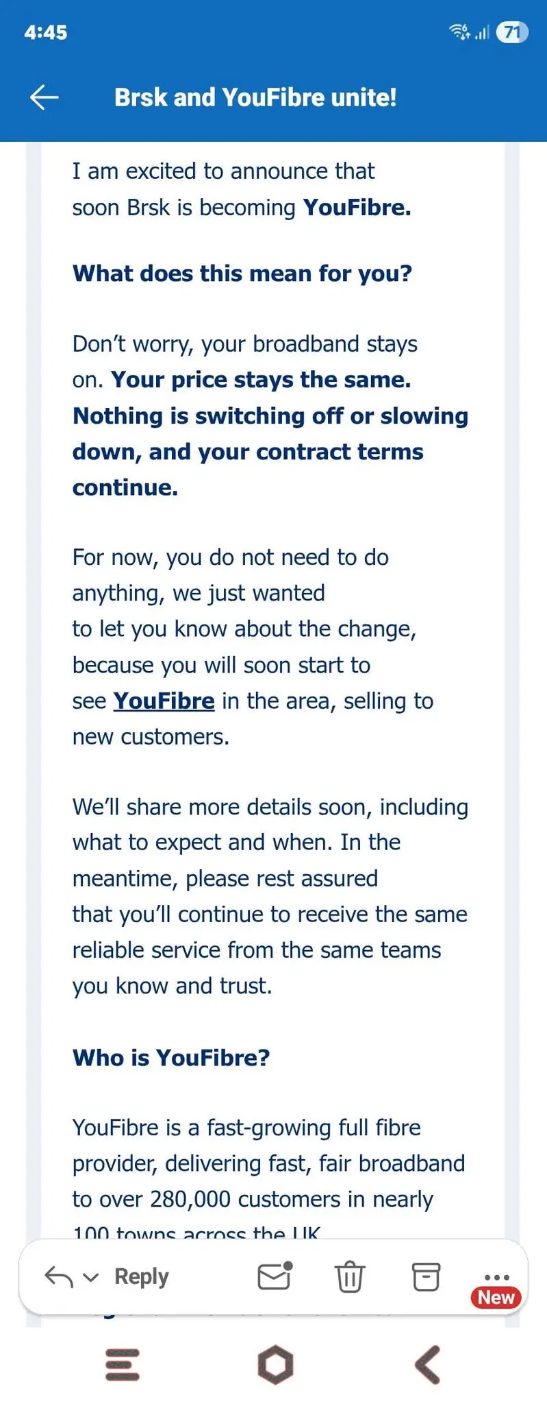 The customer email goes beyond a simple rebrand notice and actively promotes YouFibre’s credentials, suggesting the consolidation is also about confidence building. Brsk customers are told that YouFibre: